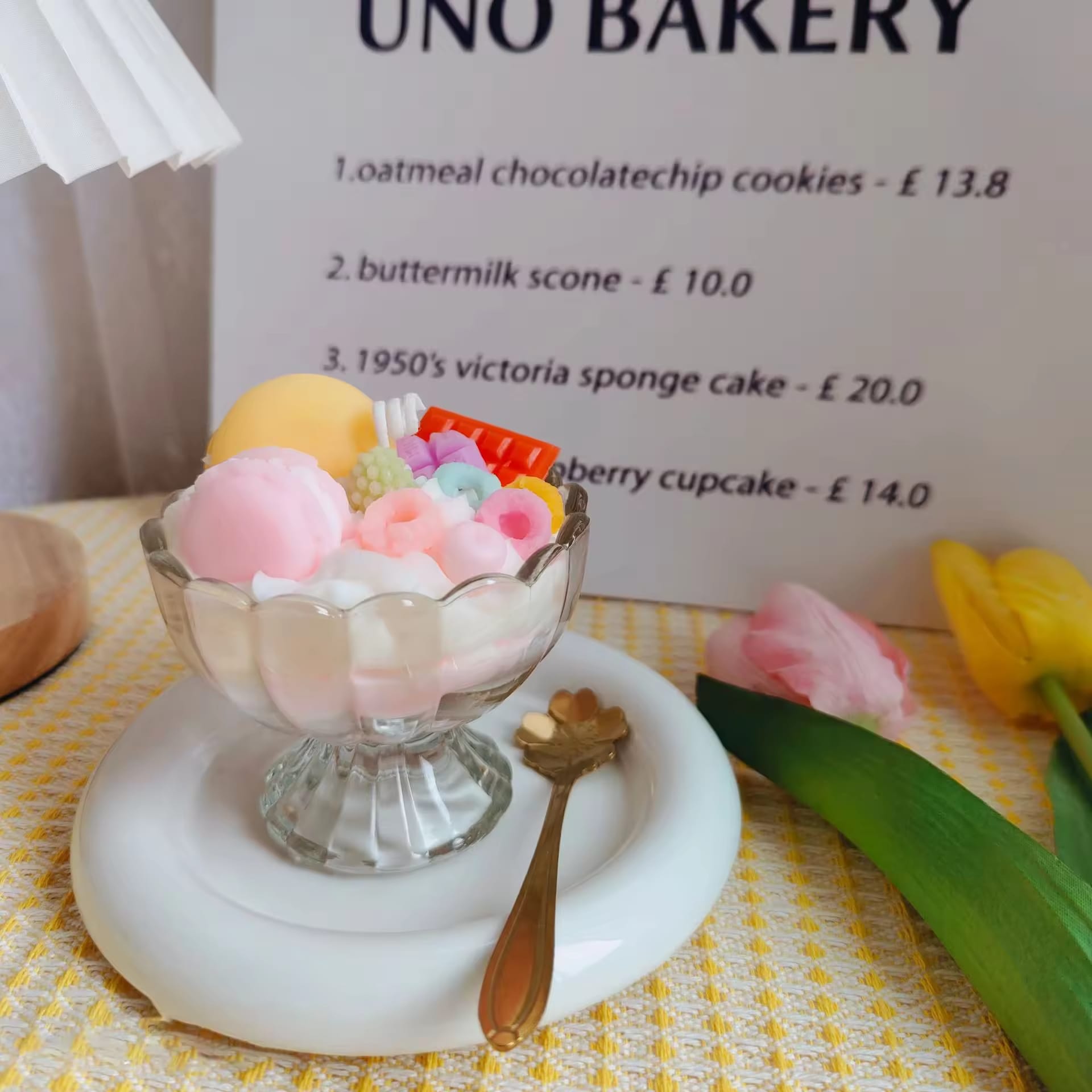 Cereals & Ice Cream Scoop Cup Candle – A whimsical dessert creation with fruity and floral notes. Its macaron-and-ice-cream inspired design adds a playful charm while filling your space with cozy fragrance.